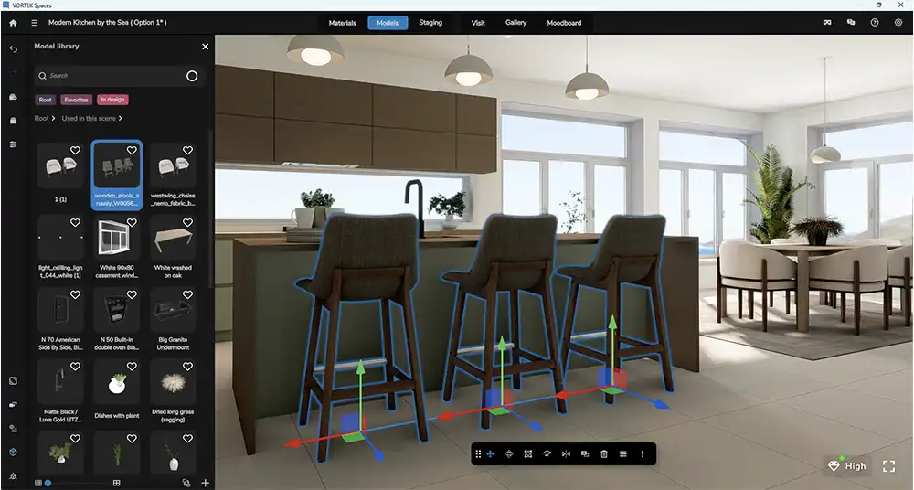 Import your 2020 files into VORTEK Spaces and bring your kitchen or bathroom project to life by adding materials for your cabinets and countertops, 3D objects like a table, chairs, and stools, and illuminate everything with warm lighting.