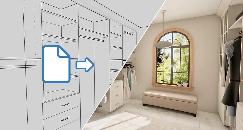 Import your ClosetPro Software files into VORTEK Spaces and bring your closet project to life by adding materials for your cabinets and 3D accessories like clothing and shoes.