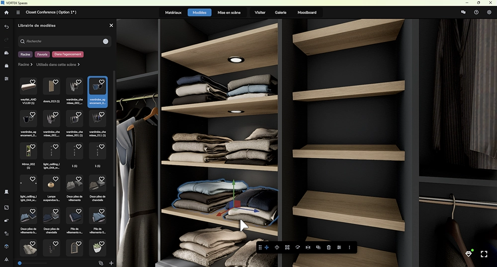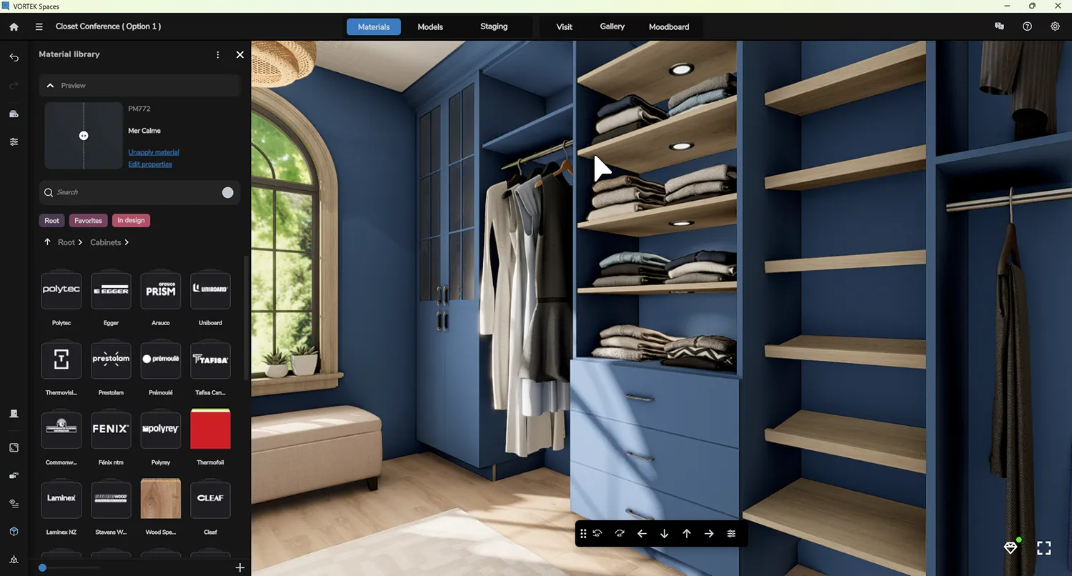 Import your ClosetPro Software files into VORTEK Spaces and bring your closet project to life by adding materials for your cabinets and 3D accessories like clothing and shoes.