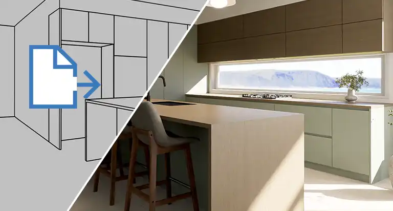 Importez vos fichiers SketchUp dans VORTEK Spaces et donnez vie à votre projet de cuisine ou de salle de bain en ajoutant des matériaux pour vos armoires et comptoirs, des objets 3D comme une table, des chaises et des tabourets, et éclairez le tout avec un éclairage chaleureux.